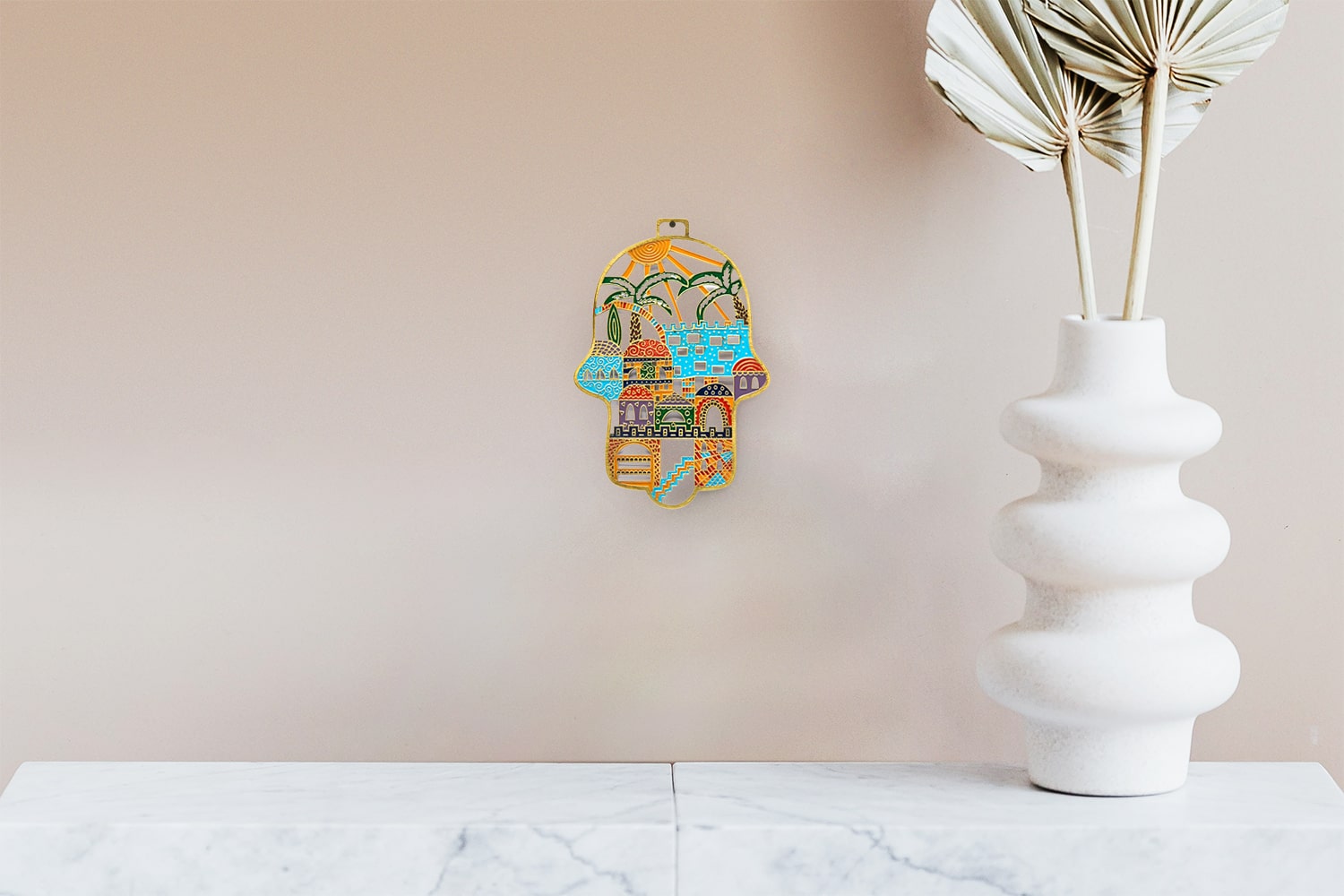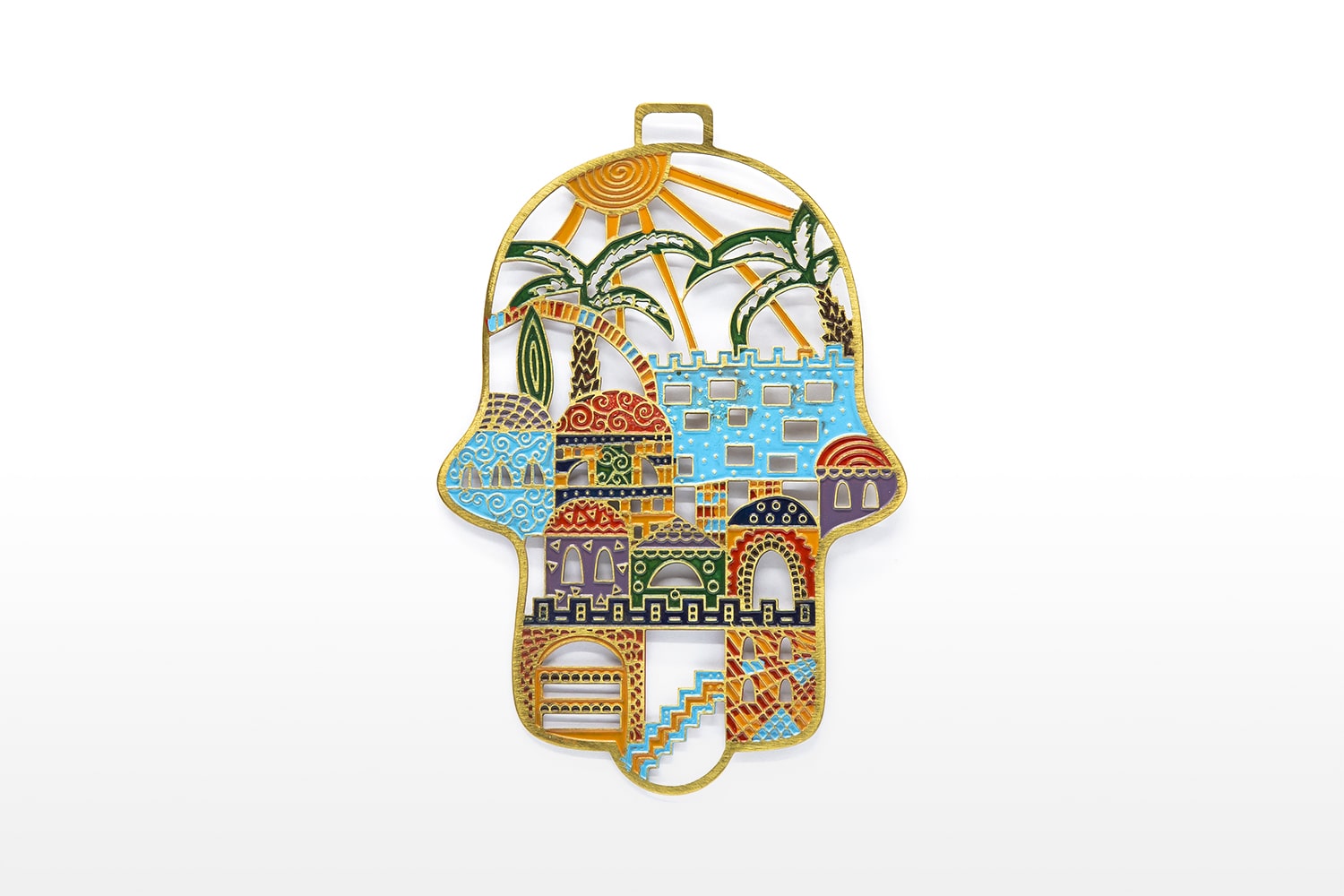 This beautiful hamsa has been carefully etched with images of the HolyCity of Jerusalem. It is a charming way to remember Jerusalem and makes a lovely addition to any room from the living room to your bedroom.